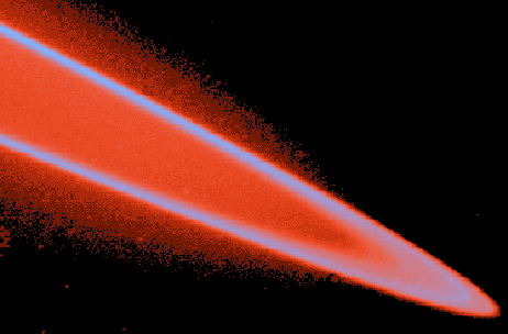 Les astronomes utilisant la sonde Voyager de la NASA pour rechercher un système d'anneaux autour de Jupiter ont découvert ces anneaux faiblement visibles en 1979. Contrairement aux anneaux brillants de Saturne qui sont composés de morceaux de roche et de glace, les anneaux de Jupiter semblent être constitués de fines particules de poussière. Une possibilité est que la poussière soit produite par des impacts avec les lunes intérieures de Jupiter. Cette image en fausses couleurs a été retouchée par ordinateur.