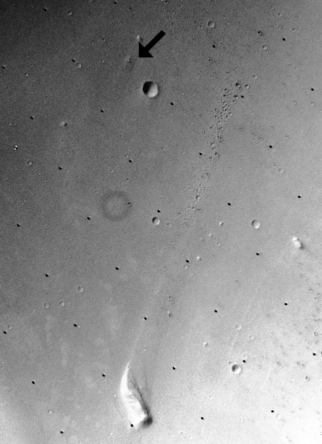 Where is Mars Pathfinder? Follow the arrow in the above picture taken by the Viking Orbiter in 1976. From the surface Mars appears covered with rocks, but from orbit Mars appears covered with craters. However, several familiar features are visible in this photograph. To the left (west) of Sagan Memorial Station are the now-familiar twin peaks that dominate the horizon of many Pathfinder photographs. These hills are about one kilometer from the landing site, twice the planned range of Sojourner. Two craters loom nearby: a small one to the east not easily visible here, and a big one to the south of Pathfinder. The landing site is in the dry flood channel named Ares Vallis.
