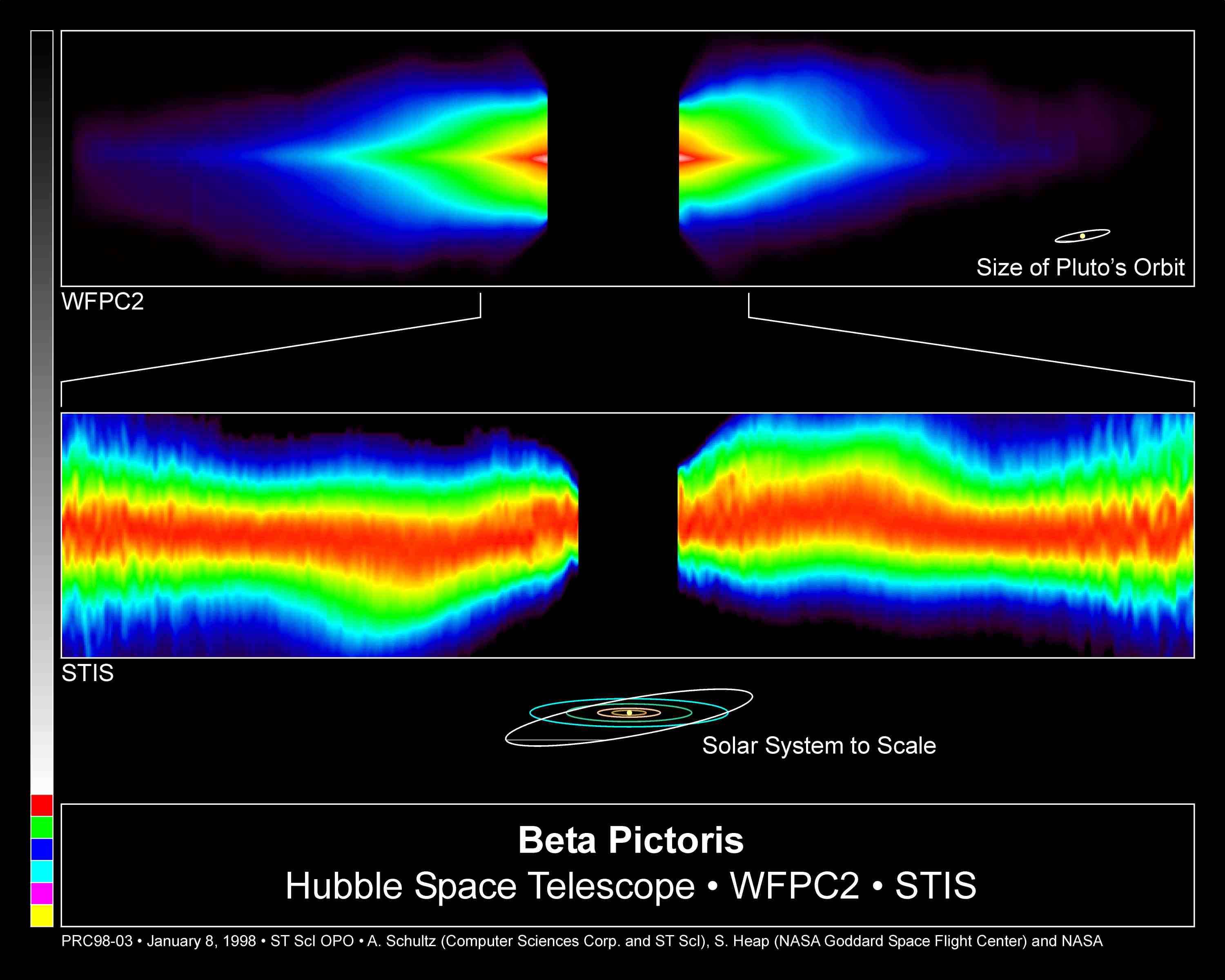 What did our Solar System look like as the planets were forming? Since the 1980s, astronomers have been pointing toward Beta Pictoris, a young, sun-like star a mere 50 light-years distant, as a likely example. Beta Pic is surrounded by a disk of dust which we view nearly edge-on. The dust disk shines by reflected starlight and has been examined with ever increasing detail to search for signs of planetary formation. The trick is to follow the disk as close in to the star as possible, without being overwhelmed by the direct starlight. To make this Hubble Space Telescope image, a coronagraph was used to block the direct starlight and achieve the closest view yet. The false color picture shows the inner section of the dusty disk to within nearly 1.5 billion miles of the star itself, about the scale of the orbit of Uranus. The obvious warp is indirect evidence that a planet now orbits this young sun, slightly inclined to the disk. The planet's gravitational pull would produce the visible distortion.