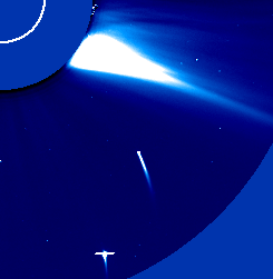 This four frame animation (courtesy D. Biesecker) shows two comets arcing toward a fatal fiery encounter with the Sun. These discovery images were recorded by the LASCO instrument on board the space-based SOHO solar observatory on June 1-2. A portion of LASCO's circular occulting disk - which blocks the blinding direct sunlight - is seen at the upper left along with a bright solar wind region extending to the right. For scale, the size and position of the Sun's edge are outlined by the white quarter circle on the occulting disk. The Sungrazer comets approach from below and have visible tails. The lower comet's coma is bright enough to cause a horizontal blemish in the digital image, while the tail of the upper comet grows dramatically as it closes with the Sun. The pair are "twins" or at least "siblings" in the sense that they are both likely members of a family of comets thought to result from the breakup of a single large parent comet. Members of the Sungrazer family can pass within 400,000 miles or less of the solar surface and many, like this pair, do not survive.