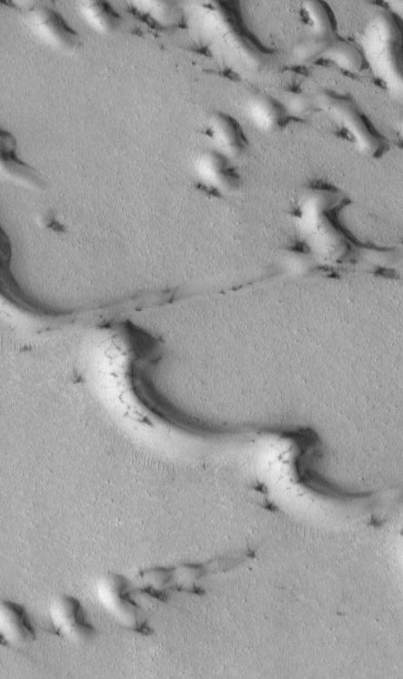 Wind erosion has been discovered on Mars. Pictures of regions surrounding the north polar cap show sand dunes covered in frost. In places, however, this frost has been eroded to uncover the dark sand underneath. Since this frost can only be as old as the Martian winter is long, this erosion must have taken place within the past Martian year. Once established, it is easy to visualize that much of the appearance of the above region has been sculpted by wind blown dust. Because the Martian atmosphere is so thin, a person standing on Mars would not get blown over by these Martian winds.